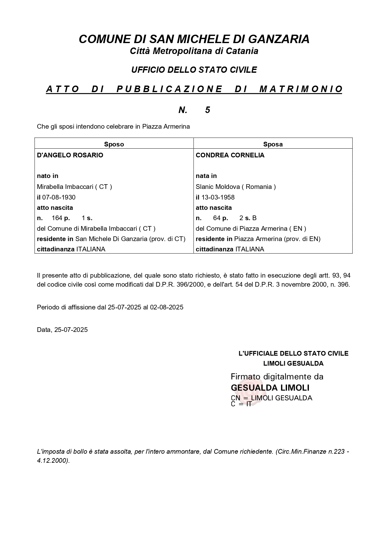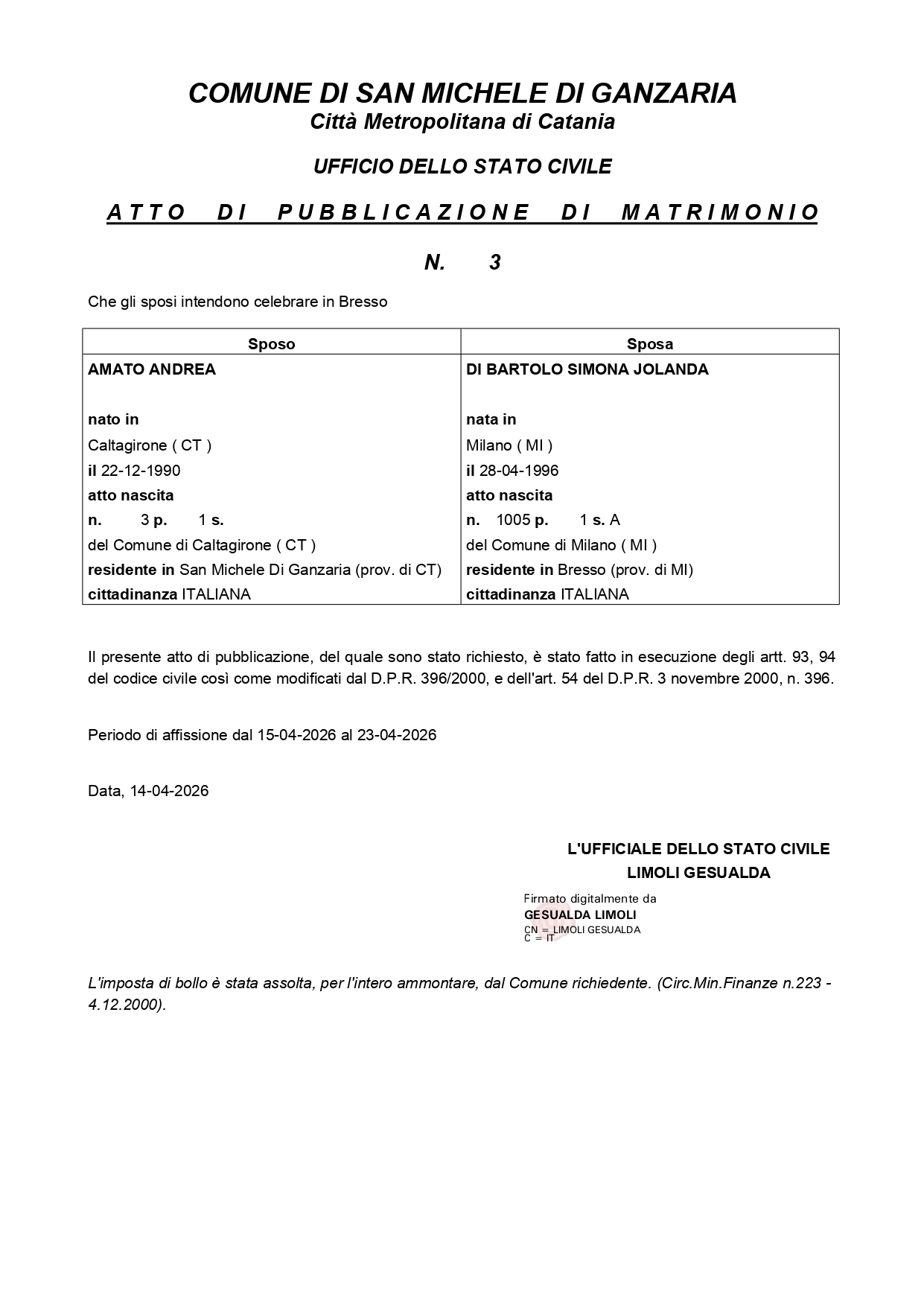 Il presente atto di pubblicazione, del quale sono stato richiesto, è stato fatto in esecuzione degli artt. 93, 94 del codice civile così come modificati dal D.P.R. 396/2000, e dell’art. 54 del D.P.R. 3 novembre 2000, n. 396.