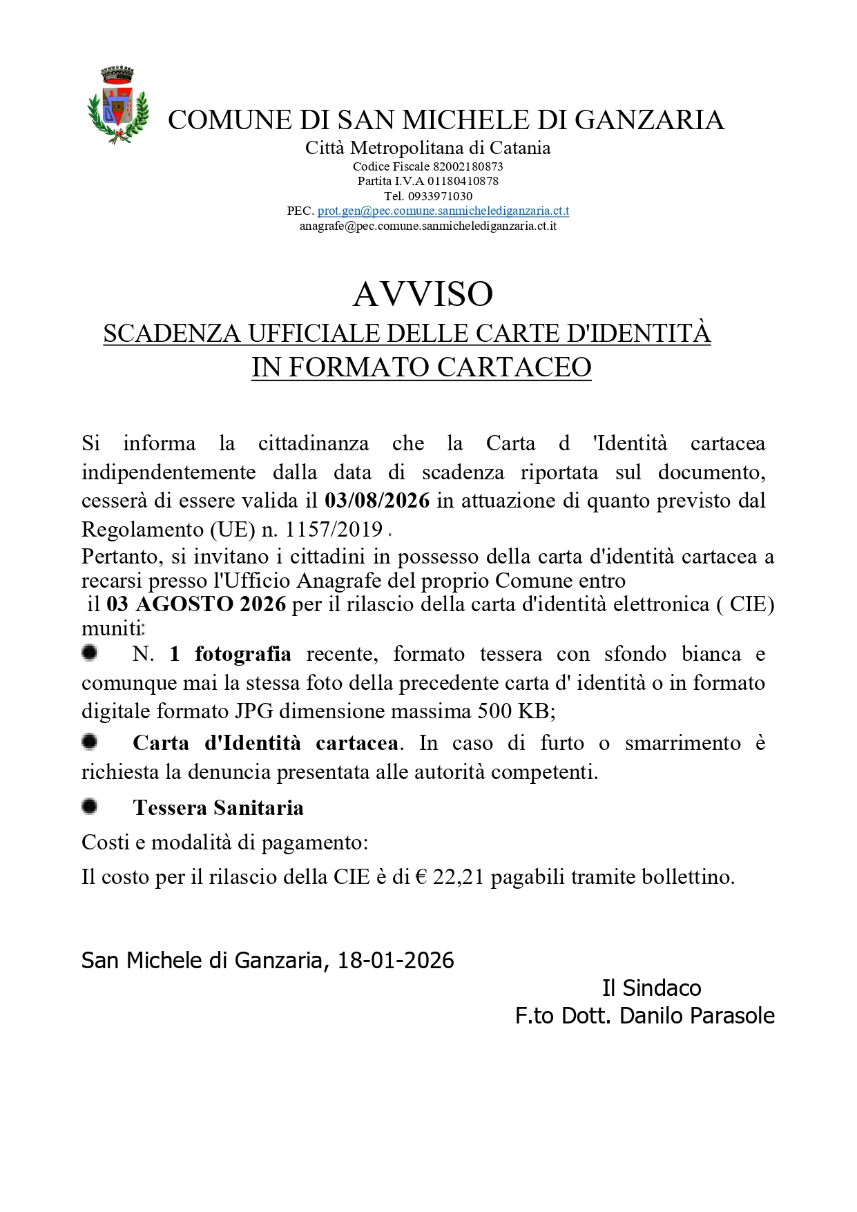 Si informa la cittadinanza che la Carta d’Identità cartacea, indipendentemente dalla data di scadenza riportata sul documento, cesserà di essere valida il 03 agosto 2026, in attuazione di quanto previsto dal Regolamento (UE) n. 1157/2019.