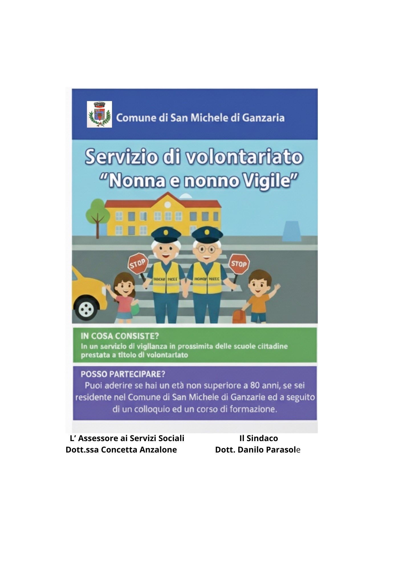 L’iniziativa, approvata con Delibera di G.C. n. 30/2025, mira a coinvolgere attivamente la nostra comunità di anziani in un servizio prezioso per la sicurezza e il benessere dei più giovani.