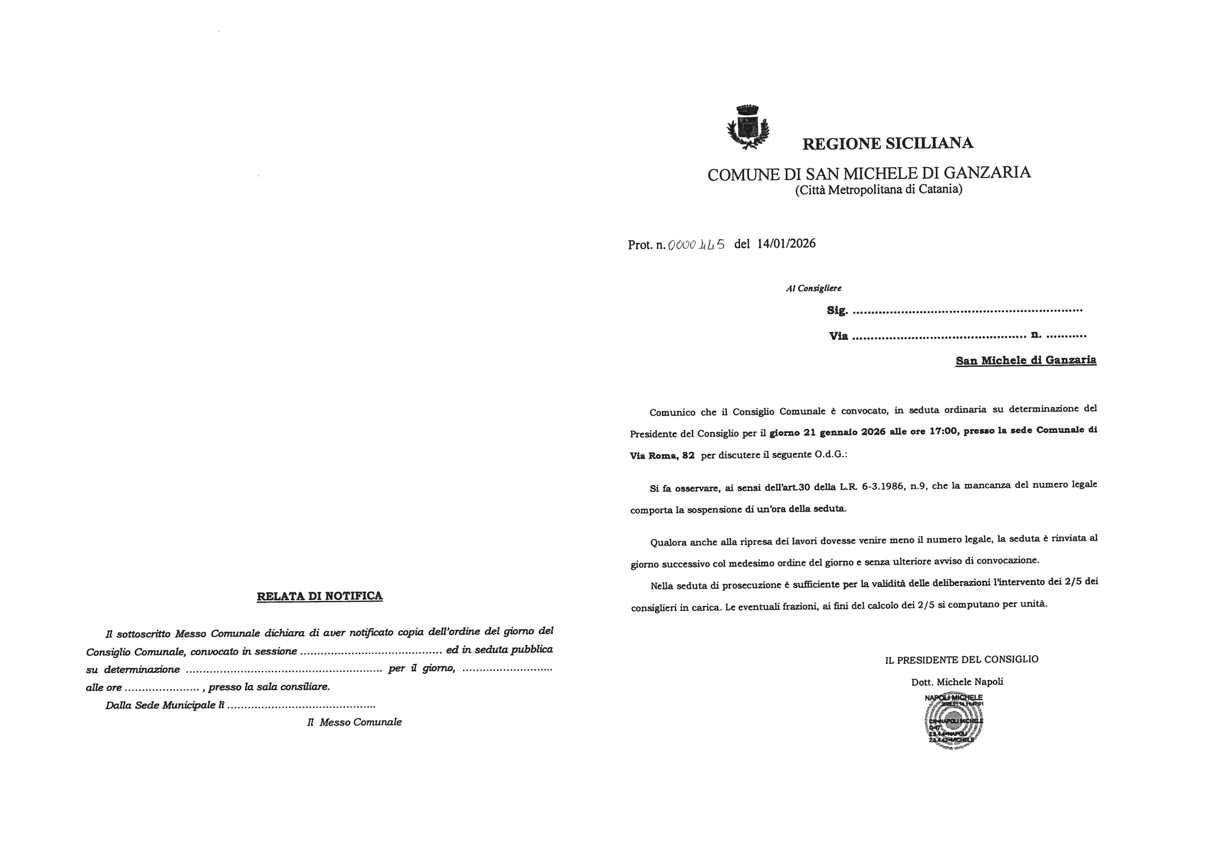 comunica che il Consiglio Comunale è convocato, in seduta ordinaria su determinazione del Presidente del Consiglio per il giorno 21 Gennaio 2026 alle ore 17:00, presso la