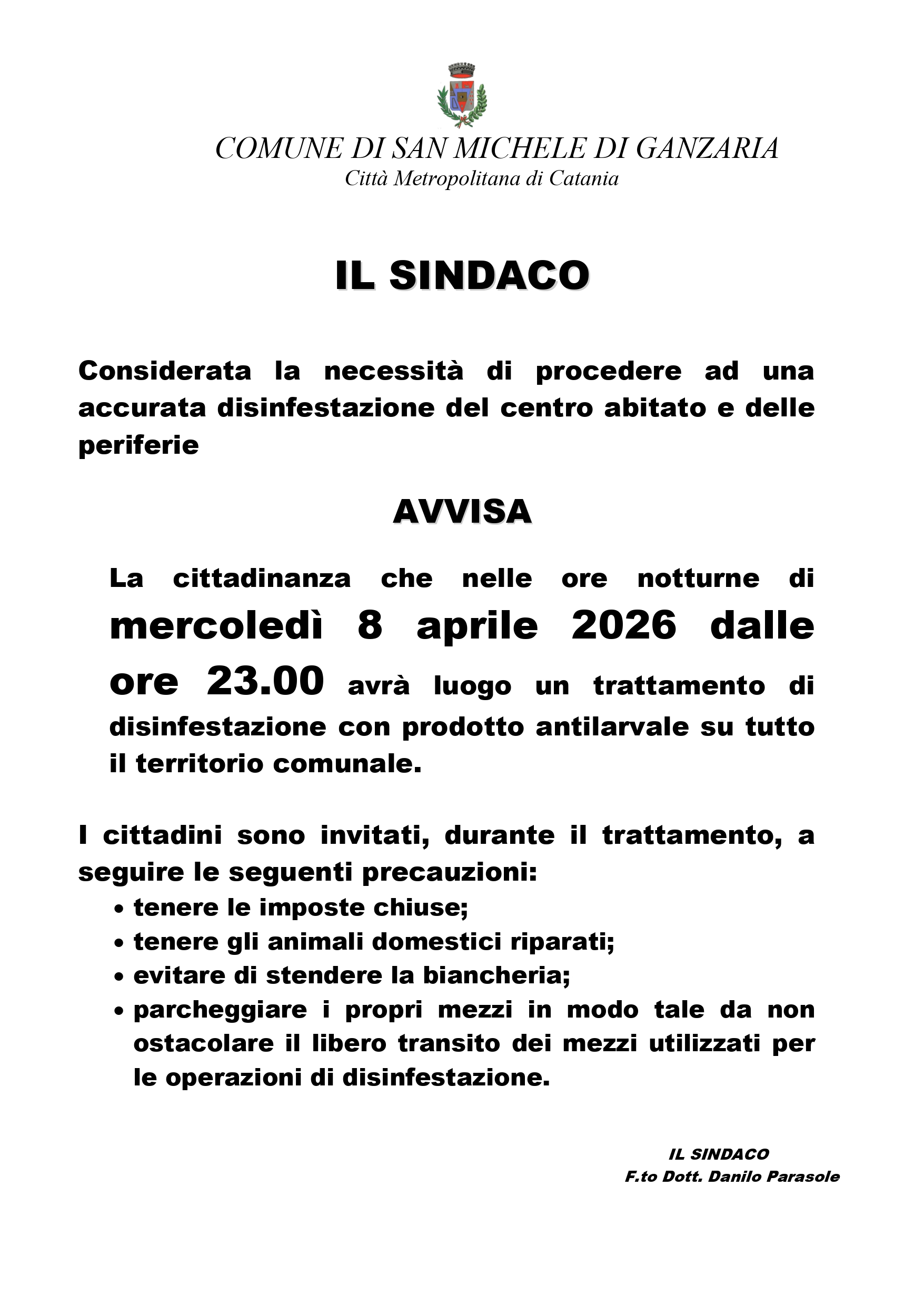 Considerata la necessità di procedere ad una accurata disinfestazione del centro abitato e delle periferie avvisa la cittadinanza che nelle ore notturne di Mercoledì 8 Aprile 2026 dalle ore 23.00 avrà luogo un trattamento di disinfestazione con prodotto adulticida su tutto il territorio comunale.