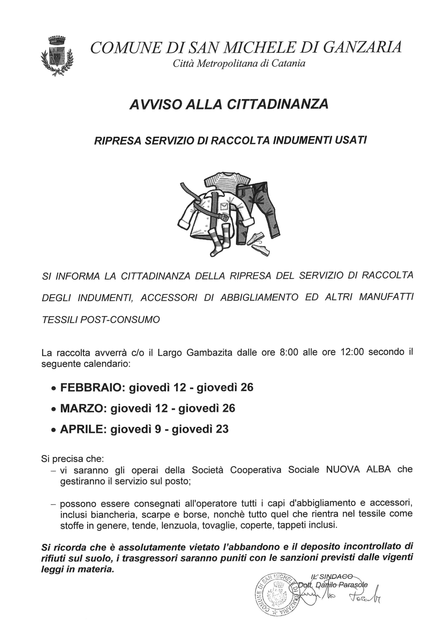 Si informa la cittadinanza che, nelle giornate indicate nel calendario relativo all’anno 2026, sarà possibile consegnare agli operatori della Società Cooperativa Sociale Nuova Alba tutti i capi d’abbigliamento e gli accessori non più utilizzati. Rientrano nella raccolta: indumenti, scarpe, borse, accessori vari e materiali tessili, inclusi tappeti